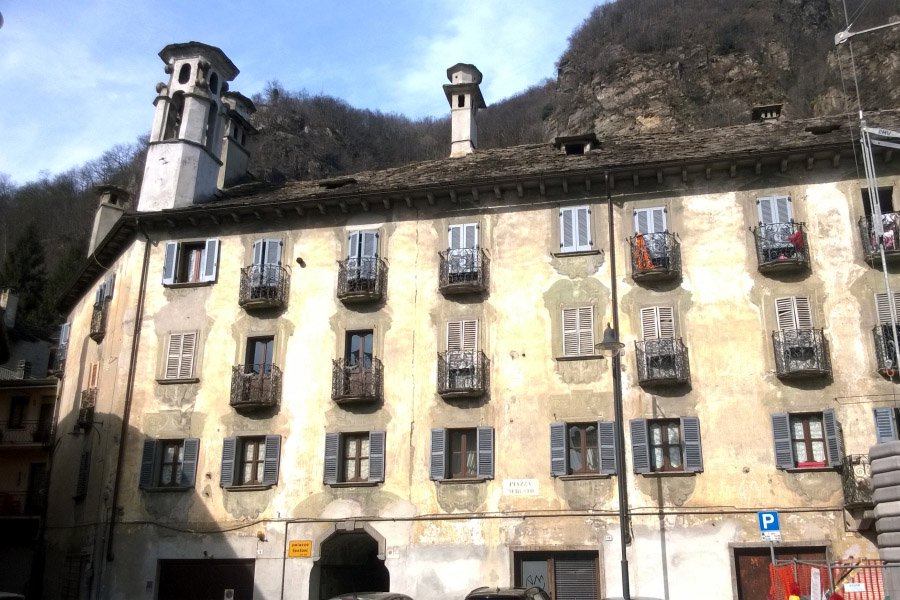 ![]() Il cammino lungo la “Strà granda” prende avvio da Piedimulera, località posta all'ingresso della Valle Anzasca sulla sinistra del torrente Anza. Fino a metà Ottocento, quando venne costruita la strada statale lungo il corso del torrente, la mulattiera era l' unica via di collegamento tra la Val d'Ossola ed il villaggio di Macugnaga da dove, lungo il sentiero walser, si saliva al Passo del Monte Moro per poi raggiungere Saas Fee in Vallese. La piazza del mercato di Piedimulera è il cuore del borgo antico, vivace centro di transito di merci e persone. Su di essa prospetta l'elegante palazzo Testone del XVI secolo decorato con affreschi sulla facciata e negli interni. La salita per Vicolo Protasi conduce verso la Torre Ferrerio, un manufatto che ancora oggi colpisce per la sua imponenza. Costruita tra il 1594 ed il 1597 (come attesta l'iscrizione ancora leggibile all'ultimo piano) la torre fu edificata insieme al palazzo adiacente destinato ad ospitare l'abitazione dell'influente famiglia dei Ferrerio. Presumibilmente in quello stesso sito già in epoca precedente sorgevano una torre o una casaforte poste a difesa della valle.