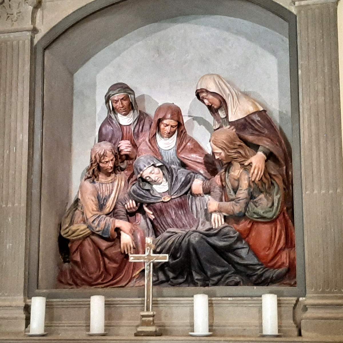 Evangelista e delle Pie Donne che partecipano alla scena indicando